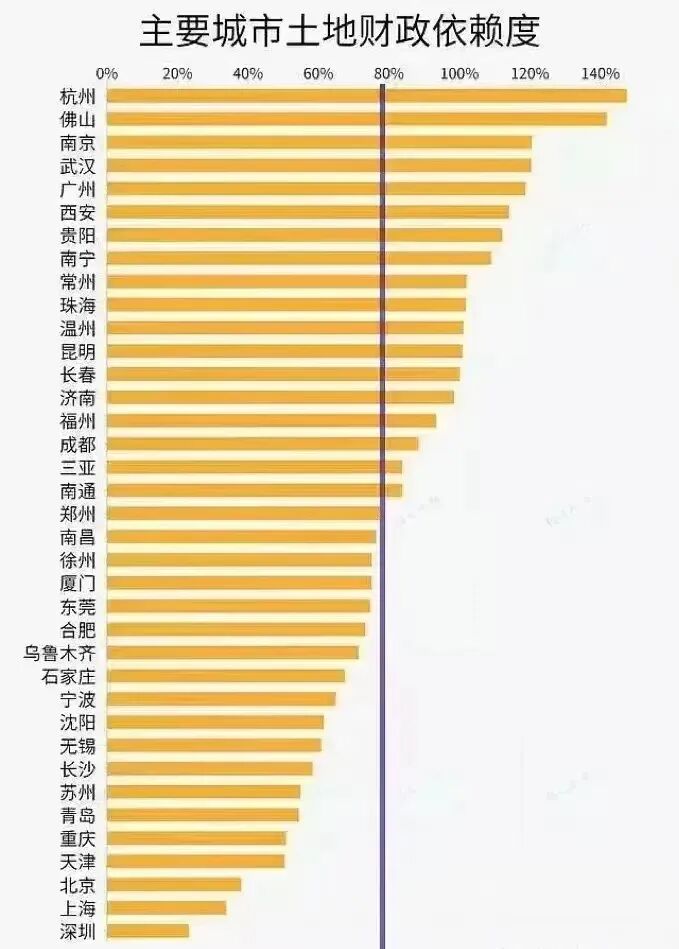 佛山是一个对土地财政极度依赖的城市,目前的依赖度在140%左右,位居全国第二,仅次于杭州。