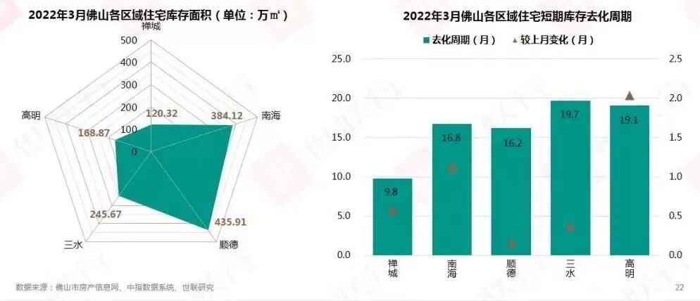佛山的库存压力,不仅表现在外围区,核心区也是一样。南海、顺德的去化周期都在16个月以上,外围的三水、高明都在19个月以上。