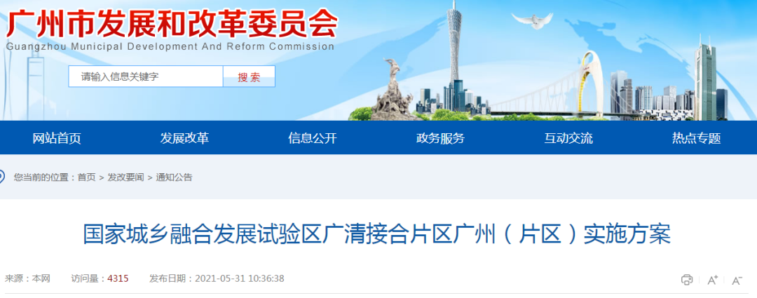 5月底,广州市发改委发布了《国家城乡融合发展试验区广清接合片区广州(片区)实施方案》,其中明确提出: