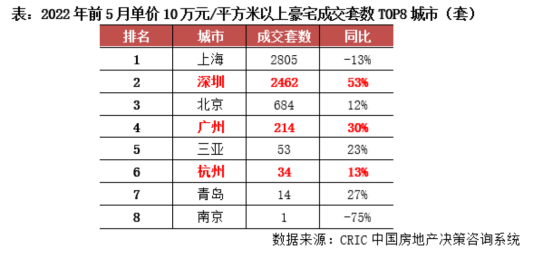 另外,根据克而瑞数据显示,2022年前5月,全国共计8个城市有单价10万元/平方米以上豪宅成交,总计成交6267套,同比增长10%。