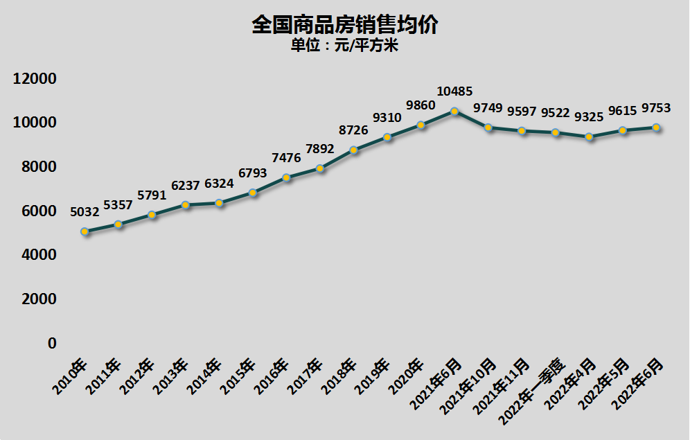 4月份之后开始筑底回升,已经连续攀升了两个月,6月份已经回到了9753元/平方米,回到了2021年10月份的水平,正一步步再次逼近万元。