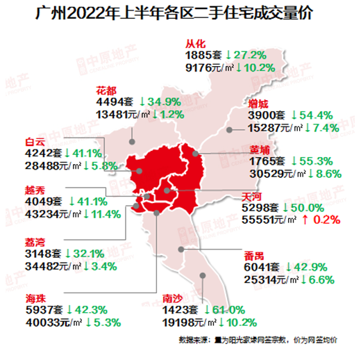 尤其是外围区的增城、从化、南沙,跌幅都比较大。增城上半年二手房成交价格下跌了7.4%,从化下跌了10.2%,南沙下跌了10.2%。