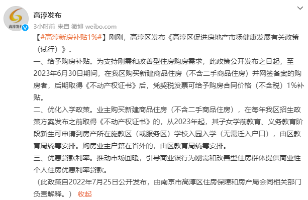 7月25日至2023年6月30日,高淳区购新房,后期取得《不动产权证书》后,凭契税发票可给予购房合同价格(不含税)1%补贴。