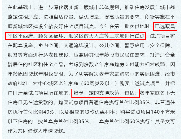 将昌平区平西府、顺义区福环、顺义区薛大人庄等三宗地作为全龄友好住宅项目试点。