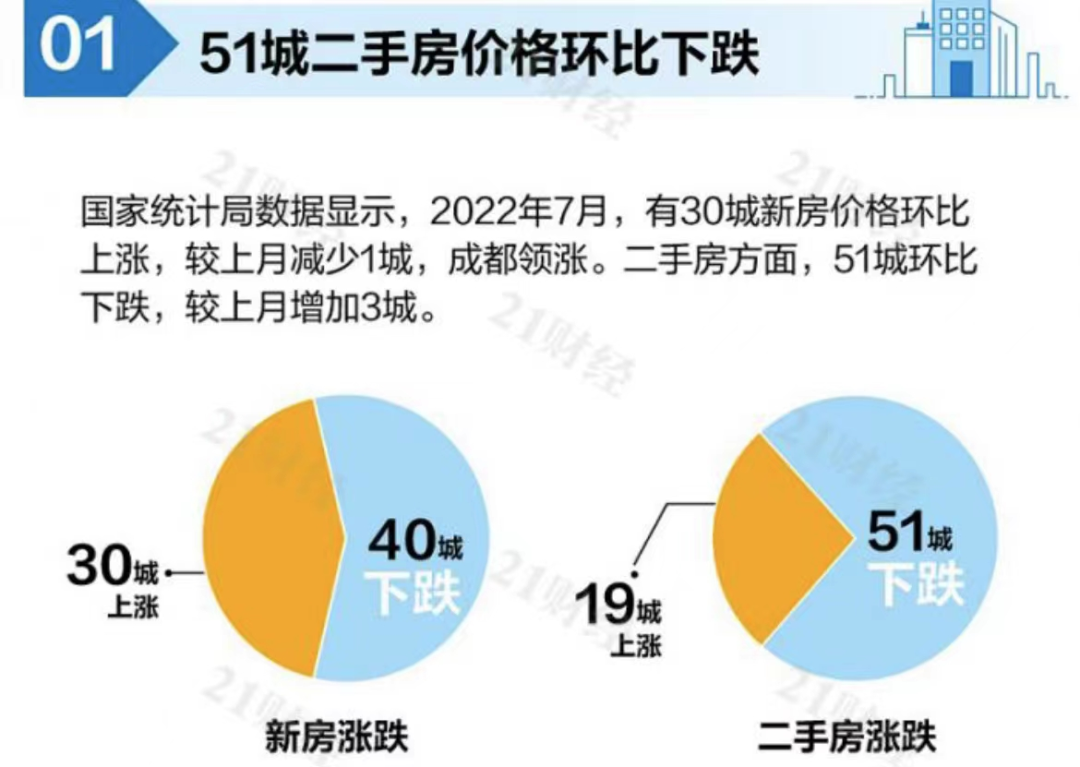我们的房价是这样的:7月份新房下跌城市40个,较之前增加了2个;二手房环比下跌城市51个,较之前增加了3个。
