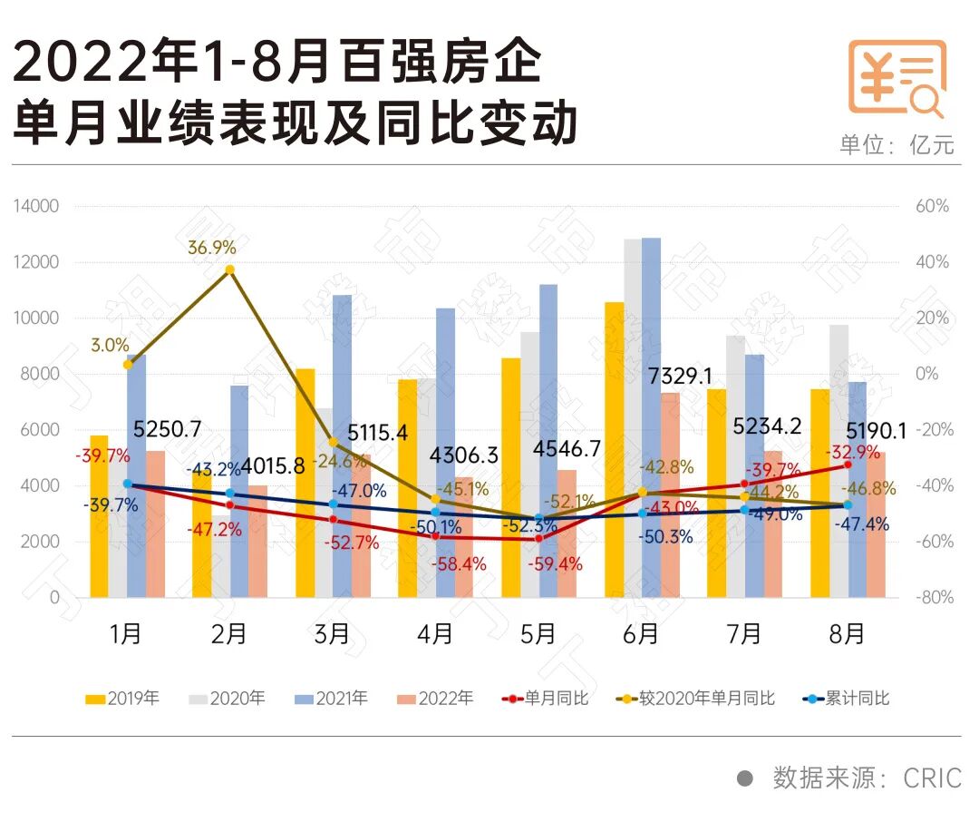 房企销售数据方面,8月销售操盘金额5190.1亿元,环比上月基本持平,同比下降32.9%,降幅收窄6.8个百分点。累计业绩来看,百强房企1-8月销售操盘金额为40988亿元,同比降幅仍保持在47.4%的较高水平。