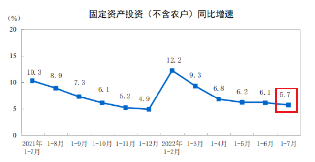 固定投资方面,增速一路下行,7月份只有5.7%。