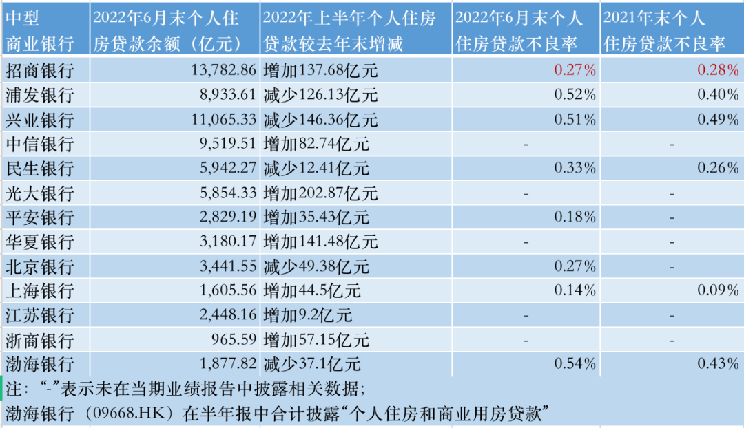 13家中型银行中有5家个人住房贷款增量为负数,也即上半年个人住房贷款相较于去年年末在减少。