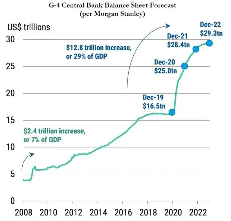 去年大摩就预测,G4央行(美联储、英国央行、日本央行和欧洲央行)的资产负债表将在两年内达到30万亿美元,高于目前的25万亿美元。