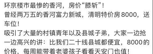 但有人的心,比堵车更堵,那就是购买了廊坊房子的投资客。因为据某房产大V披露,廊坊北三县之一的香河,房价出现“膝斩”。