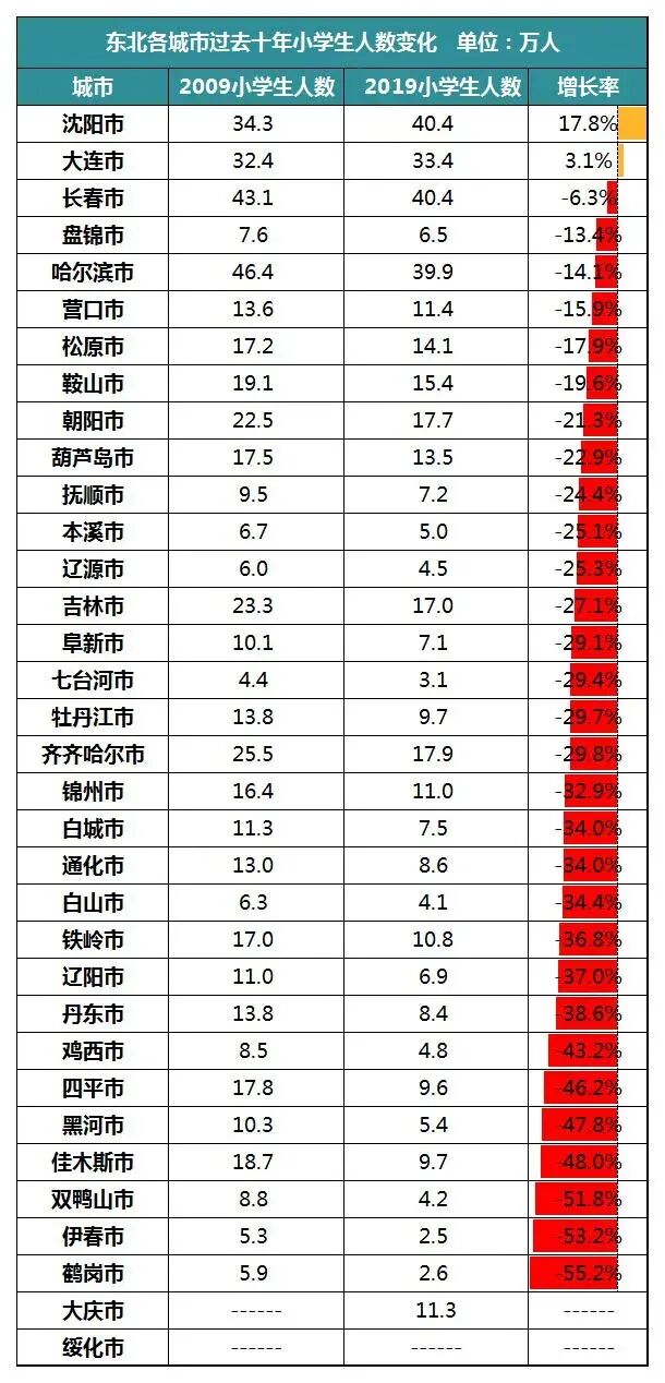 具体到城市又如何?本号此前梳理过东北三省40多个地级以上城市小学在校学生过去十年变化情况。