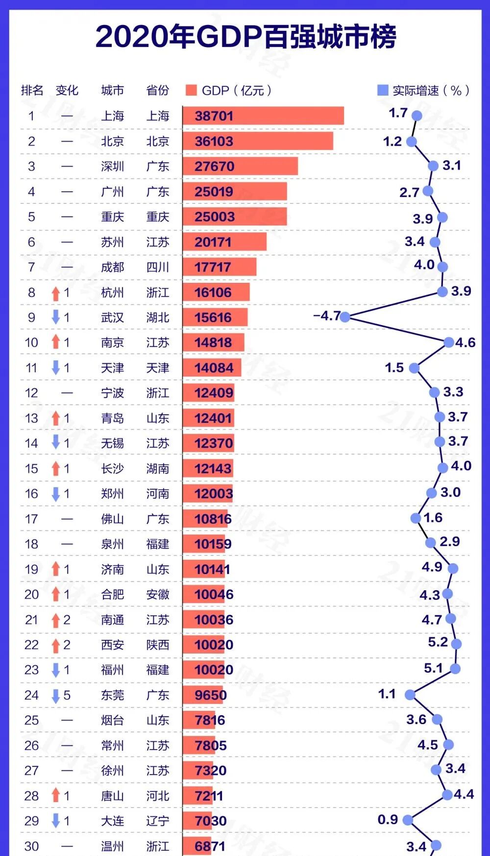 比如在经济排名中,前十城市有9个是南方城市,北方只有一个北京。在前30名中,南方20个,北方只有10个。