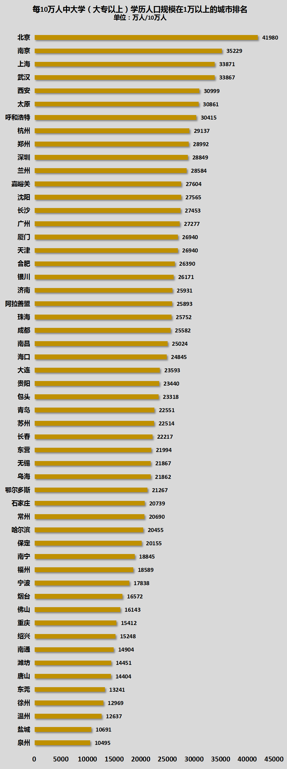 1、全国所有城市中,有44个城市的大学学历人口占比超过全国平均线(全国每10万人中拥有大学学历人口为15467人)。