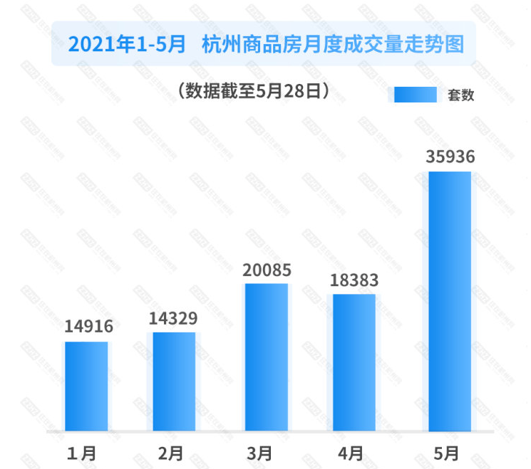 数据显示,5月(截至5月28日)的杭州商品房累积成交套数35936套,是近十年以来,杭州商品房月度成交量的新高。