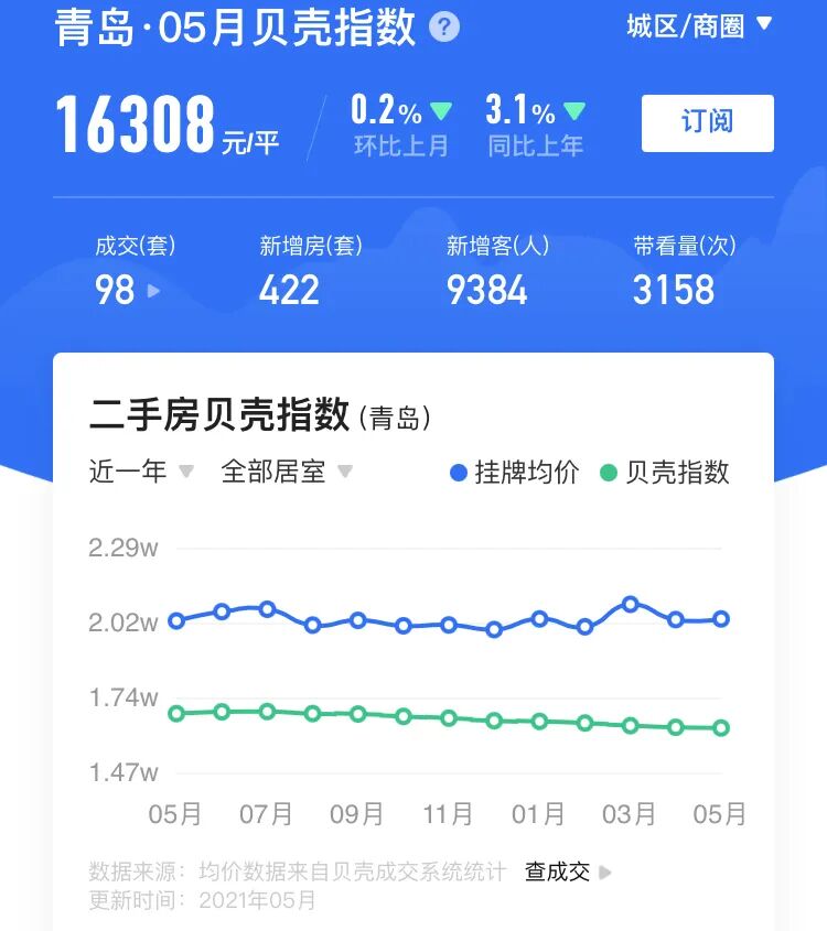 根据贝壳数据显示,5月份青岛二手房价格环比下跌0.2%,同比下跌3.1%。