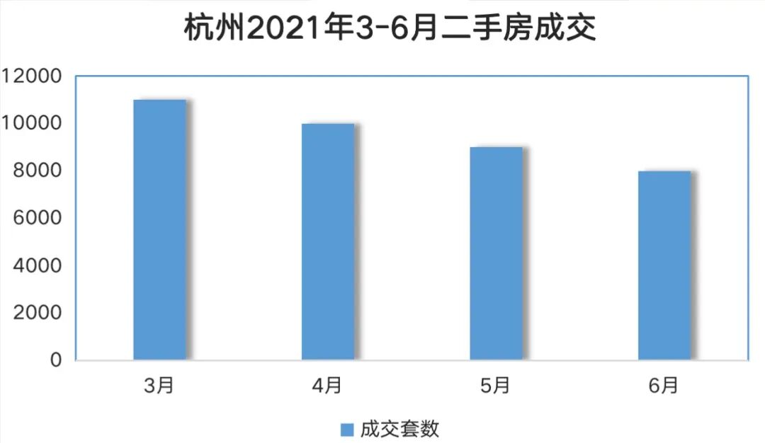 6月份,二手房成交量继续下探,全市(除临安、富阳)签约量7800套,环比下降13.4%。