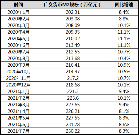 7月末,广义货币(M2)余额230.22万亿元,同比增长8.3%,增速分别比上月末和上年同期低0.3个和2.4个百分点。