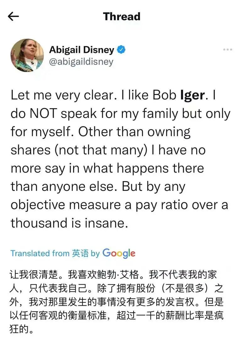 但艾格的高收入仍然让阿比盖尔无法理解,嘉奖高管无可厚非,但基层员工也不应该被忽视。“CEO的薪水是员工中位数工资的500、600、700倍,耶稣也不会拿那么多工资。”阿比盖尔对CNBC说。