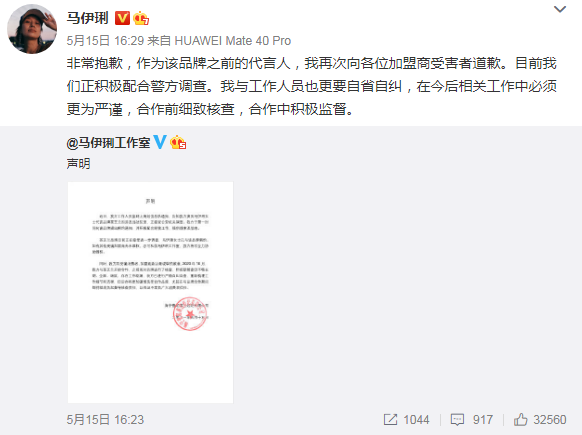 马伊琍微博发布道歉声明