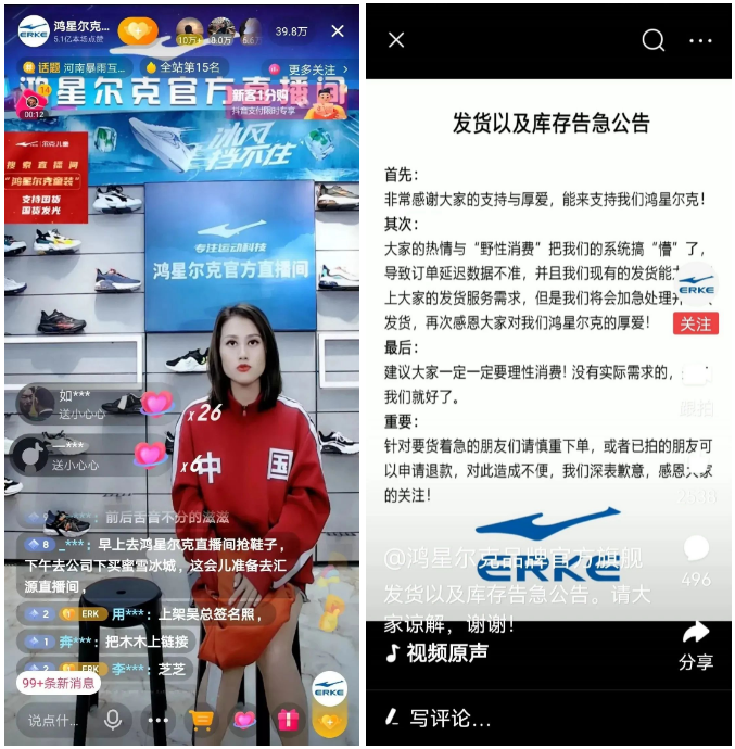 自己还在亏损却向河南灾区捐出5000万元物资后,沉寂已久的鸿星尔克得到了消费者的野性“宠爱”,原本顾客寥寥的直播间涌入上千万粉丝。