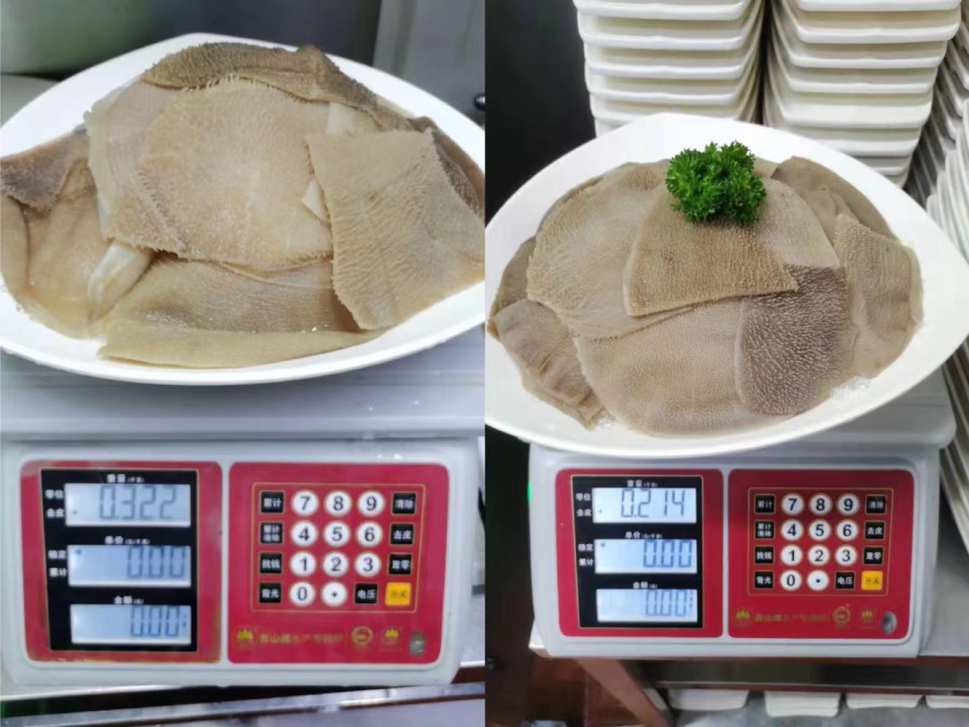 同一份毛肚,4个小时之后,重量从322克缩水到了214克。记者供图