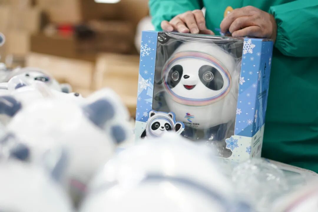 2月8日,工人在特许生产商的车间里包装“冰墩墩”。季春鹏摄(新华社)