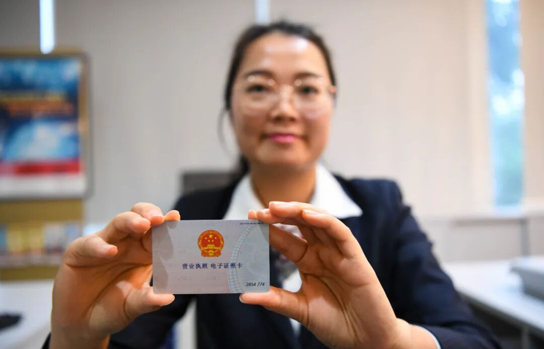 工作人员展示商事主体电子证照银行卡。邓华摄(新华社)