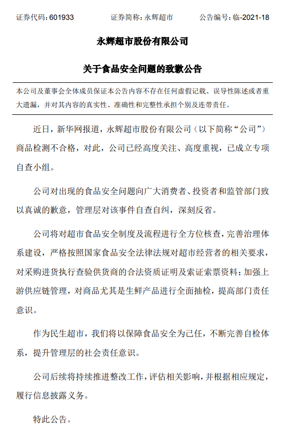 为什么说突然呢?因为很多人是先看到这条道歉,然后才得知前两天福建省市场监督管理局发布消息,称永辉超市多家门店有15批次食品抽检不合格,被媒体报道了。
