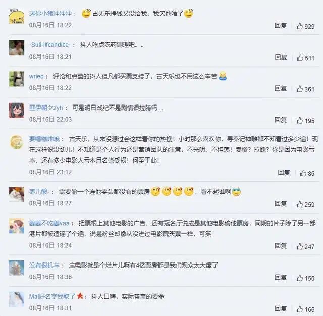 毫不夸张地说,发表这样的言论,显然是影迷过度应援的表现,这样做不仅不会得到响应,反倒会引起了观众们的愤怒,从而产生抵触情绪。比如就有观众反问道:“古天乐挣钱又没给我,我欠他啥了?”