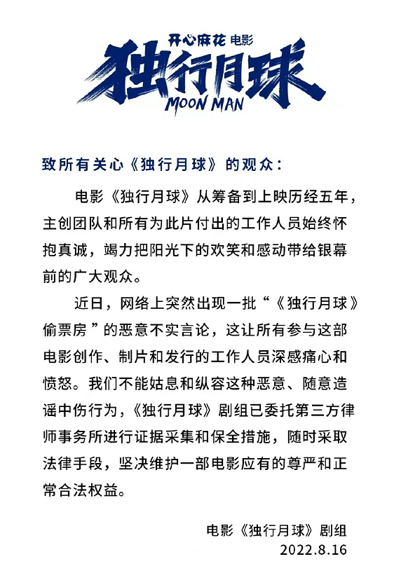 可是有少部分影迷唯恐天下不乱,自始至终都觉得《明日战记》是一部好电影,但为什么票房会如此惨淡不济,实在是想不通,弄不明白,于是便整出一套阴谋论,居然去怀疑《独行月球》偷票房,后来《独行月球》剧组在第一时间对外发布声明,表示将会采取法律手段维权到底。