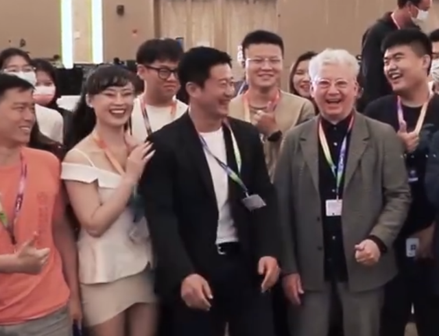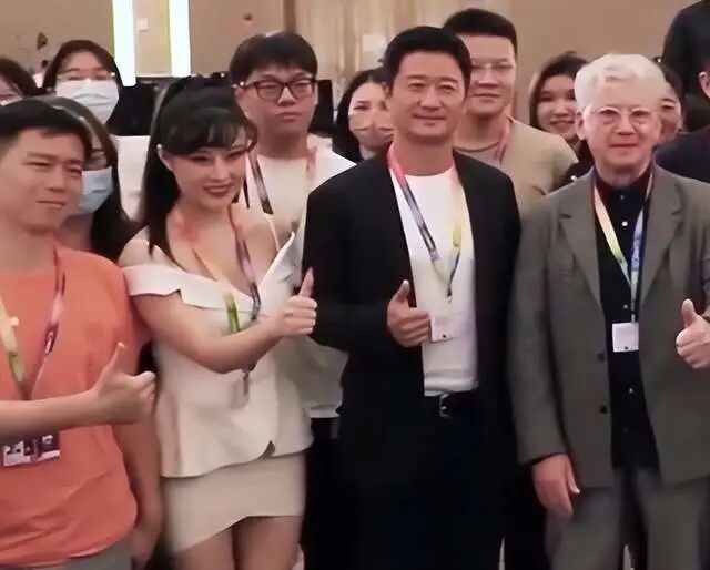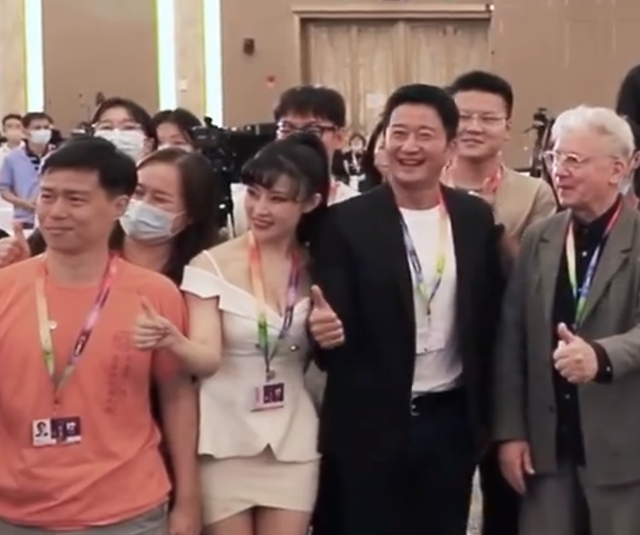 从合影照中可以清楚地看到,吴京右手边站着一位浓妆艳抹的神秘女子,脖子上佩戴着会场配发的嘉宾证,应该是有头有脸的圈外人士,或者是名不见经传的女演员。