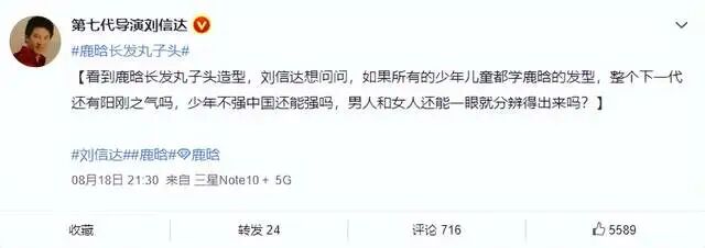 比如以毒舌闻名圈内的导演刘信达,看到这条鹿晗这个热搜话题后,一针见血指出是在带坏少年儿童,还说如果下一代都学鹿哈这样弄长发丸子头造型,这无疑是没有阳刚之气的,而且让人无法分辨出是性别。