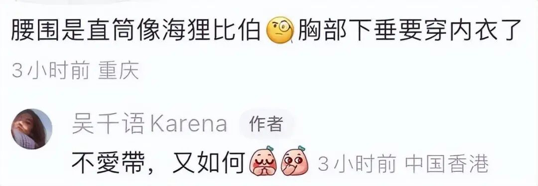 正是因为穿得少的缘故,所以鸡蛋里挑骨头的事是在所难免的,更何况吴千语穿得这套泳衣过于紧身,很容易暴露出细节部分,比如说身体的一些敏感部位,包括网友吐槽她没有穿内衣,胸部才会下垂严重。
