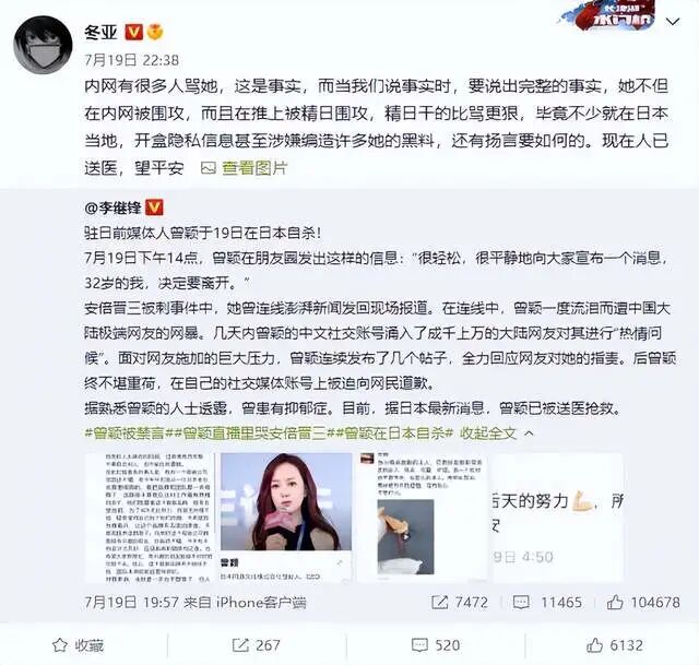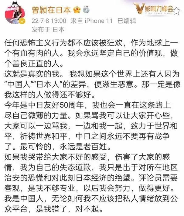 可是让人万万没想到的是,曾颖在直播连线过程中,在聊到安倍晋三的时候,情绪是比较低落的,无意识微微哽咽了一下,于是便遭到了大量网友的攻击和辱骂,说她这是在同情安倍晋三,做出了伤害国人感情的行为。