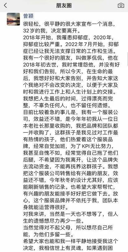 本以为曾颖真诚去道歉能够缓解舆论压力,但想象是美好的,现实却是残酷的,外界对她的网暴并没有停止,反倒愈演愈烈,包括在日本那边也有人对她进行威胁恐吓。沉默了一个多星期后的曾颖,终于扛不住了压力,在朋友圈写下了遗书,自曝罹患抑郁症多年,已经无法支撑日常的工作和生活,决定要离开这个世界。