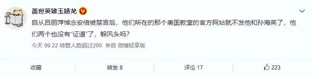 8月23日,据一位名叫“盖世英雄玉娇龙”的互联网博主在微博上爆料称,影后吕丽萍自从悼念日本前首相安倍晋三被禁言,失去了利用价值后,遭到美国那边的教堂边缘化,官方网站没有再发布与之相关的内容,很有可能是为了避嫌躲风头。