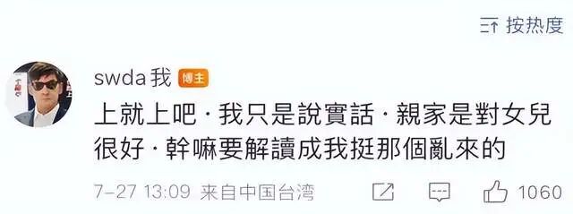 不过话说回来,这届网友确实管得太宽了,郭碧婷爸爸都已经如此旗帜鲜明支持亲家,却还是有人绞尽脑汁带节奏,刻意制造出两家闹矛盾,非得把向佐和郭碧婷的婚姻给毁掉,这样的做法确实太过分了。