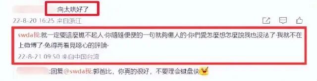 显而易见,该网友是有意在挑拨他跟向太陈岚的关系,郭碧婷爸爸看到后感到特别的生气,直接回怼了一句:“就一定要这么瞧不起人,你随随便便的一句就够伤人的,你们爱怎么想怎说我也没法了,我就不再上微博了,免得再看见恶心的评论。”
