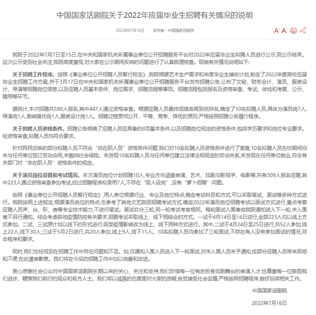 而就在昨天,国家话剧院就编制风波作出了情况说明,称今年报考的应届生都是有通过资格审查和参加考试,而且招聘程序均合法合规,不存在“因人设岗”和“萝卜招聘”的情况。