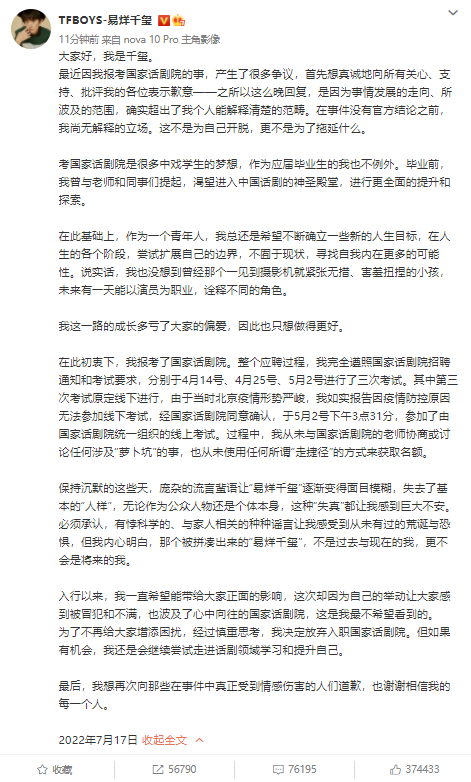 7月17日上午, 超人气偶像巨星易烊千玺发长文回应了考编风波,表示自己报考国家话剧院是他的梦想,也是不断提升自我的一次机会,但没想到事情会愈演愈烈,完全超出了他个人能够解释清楚的范畴。