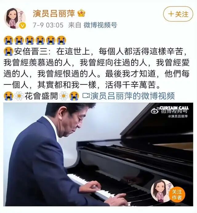 但凡稍微了解历史常识的人都知道,安倍晋三不仅是日本人,而且还是战犯的后代。可吕丽萍在第一时间得知他遭到枪杀后,居然表现出伤心欲绝的模样,如同失去亲人好友一般,配上了九个痛哭流涕的表情符号,最后还真挚送上祝福“花会盛开”。