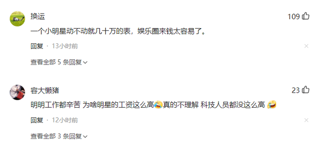 本身徐璐穿露背装就已经很有话题度了,再加上她被扒出戴奢侈名表,这无疑会让话题变得更加敏感尖锐,从而激发出不少人的仇富心理。对此,有不少人看到后纷纷表示不能理解,说徐璐这么一个名不见经传的小明星,动不动就是几十万的手表,这娱乐圈来钱也太容易了吧。