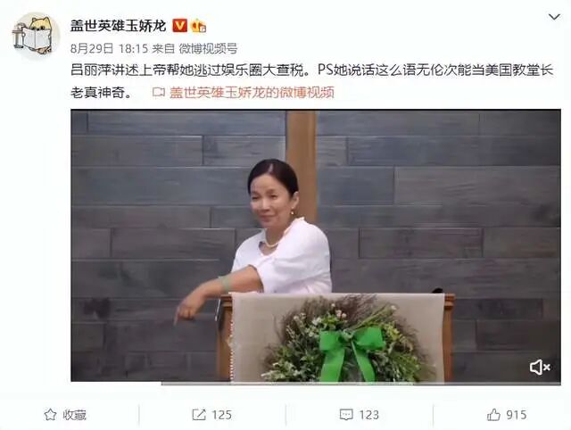 8月29日,互联网科技博主盖世英雄玉娇龙在微博上爆料称,因悼念安倍晋三被禁言的影后吕丽萍,消失一段时间后又重新出现在了公众视线当中,并亲临教会现场给教徒们传教,自曝上帝帮她逃过了娱乐圈大查税,再次在全网引发了巨大的热议。