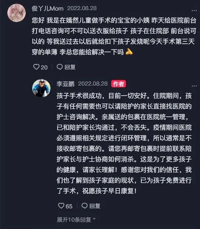 近日,一位自称在嫣然天使儿童医院做过手术的病患家属,为了能够寻求到帮助,特意跑到知名男演员李亚鹏社交账号底下留言,希望他能够帮解决一下给住院孩子送衣服的问题,没想到却得到了对方的耐心答复,引起了很多人的关注。
