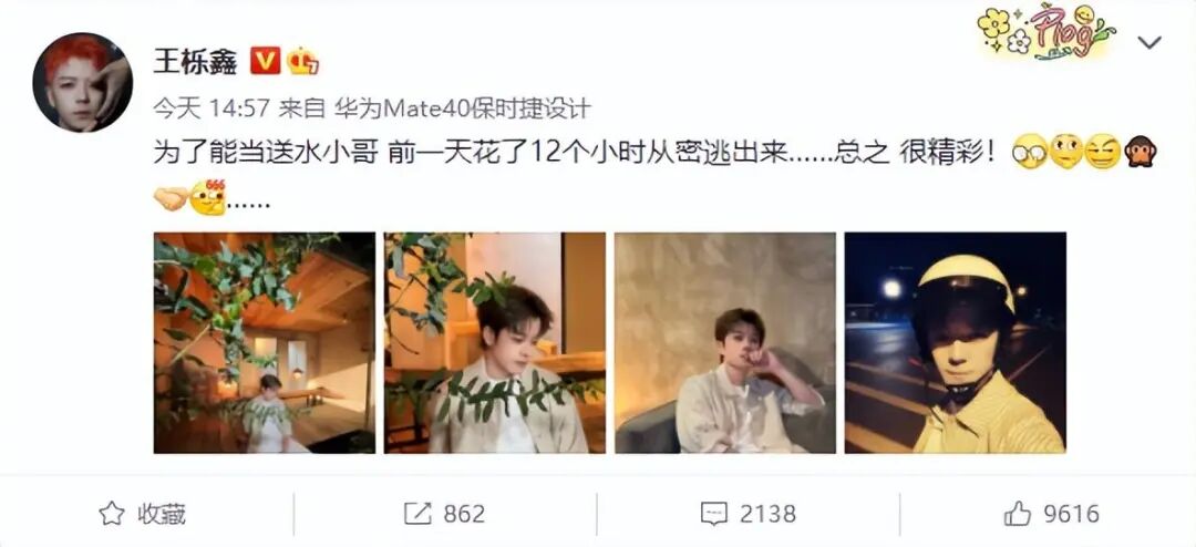 9月4日,知名男歌手王栎鑫通过微博自曝称,为了能够当送水小哥,前一天花了12个小时从密室逃出来,不仅没有喊累反倒觉得这样的生活很精彩。同时他还晒出了自己头戴安全帽,在深夜骑电动车送水时候的自拍照,引起了很多人的关注。