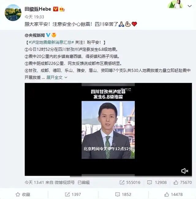 9月5日晚,知名女歌手田馥甄通过微博转评了央视新闻报道,发文祝愿四川能够平安,提醒大家要注意安全小心余震,引起了很多人的关注。而就在上个月,她因在海外社交平台上发表不当言论,遭到了全网的炮轰和抵制。