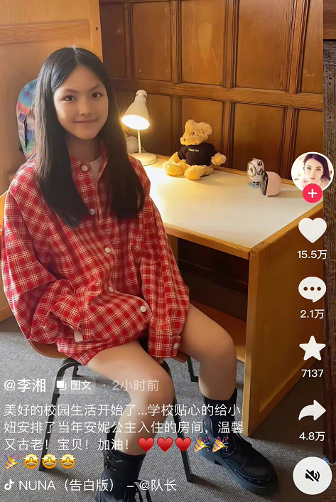 日前,知名女主持人李湘通过个人短视频账号,分享了爱女王诗龄在英国入学的照片,并配文表示学校给王诗龄特意安排了安妮公主入住过的房间,让她们母女俩感到特别的贴心温暖,希望女儿不负众望多多加油。