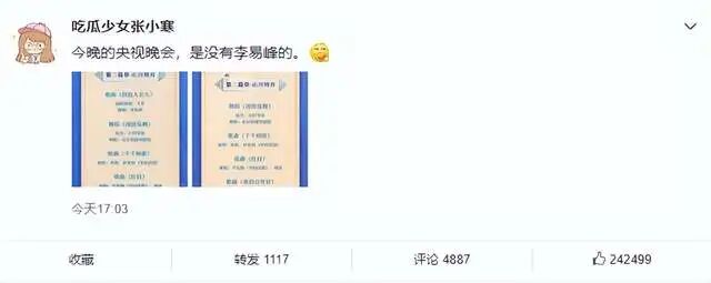 后来张小寒没有正面去回应这位网友的喊话,但却换了一种方式去回应,说今晚央视中秋晚会没有李易峰,并且晒出了两张不同的节目单,以此来佐证李易峰很有可能出事了。