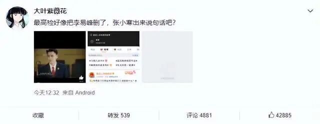 不过话说回来,这件事确实挺蹊跷的,完全是在毫无征兆的情况之下发生的,但还是可以从中找到一些蛛丝马迹,比如一位名叫“大叶紫薇花”的网友在微博上爆料称,说最高检好像把李易峰删了,希望知名狗仔张小寒能够出来说句话。