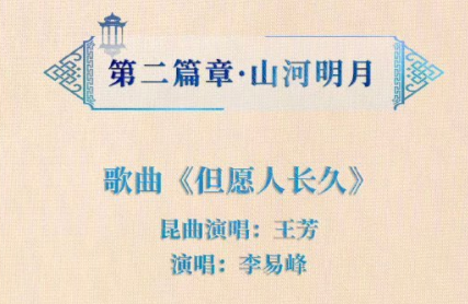 从早前央视对外预告的节目单中,可以非常清楚地看到,第二篇章的第一个节目就是由李易峰演唱的《但愿人长久》。